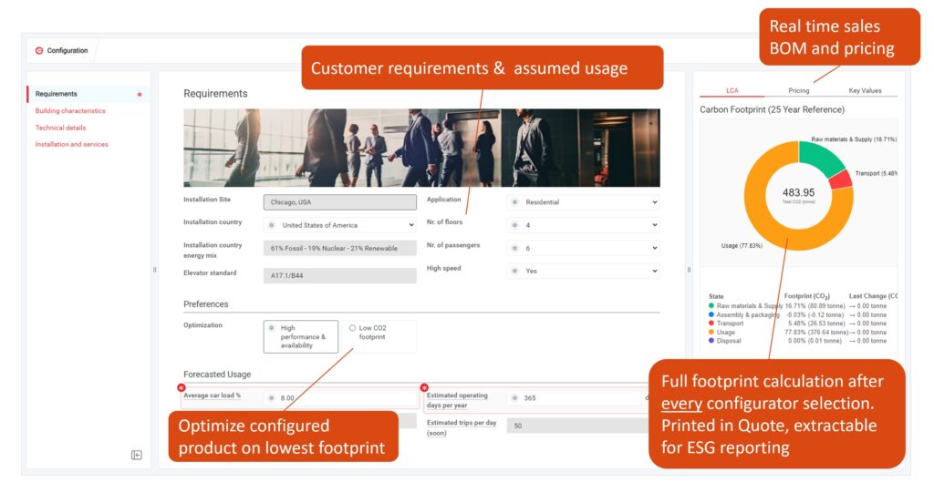 The result was a working prototype in Tacton’s CPQ tool with a fully configurable elevator, where LCA results for a customer-specific elevator can be calculated at the push of a button.