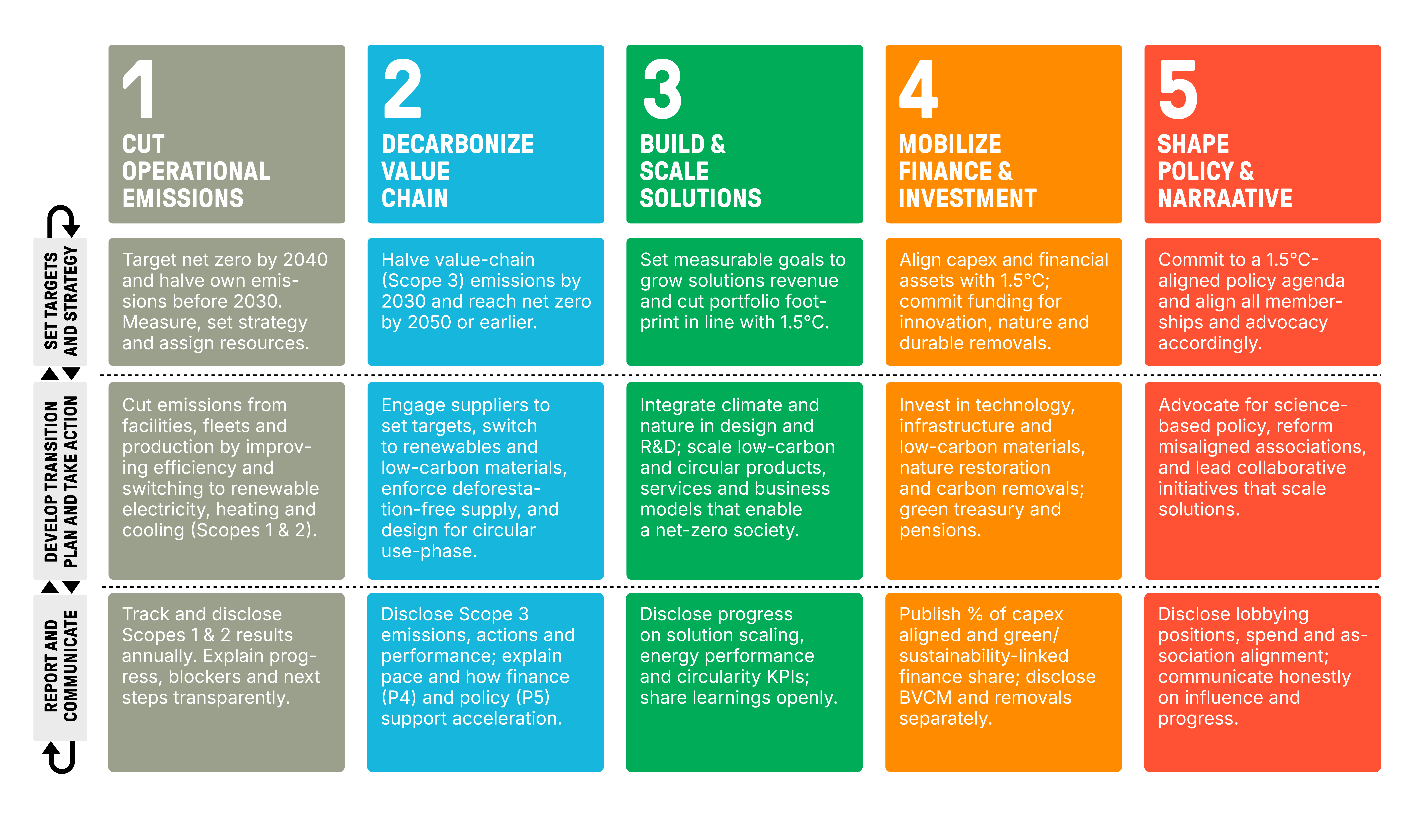 Playbooken bygger på fem pelare som tillsammans beskriver vad det innebär att vara ett 1,5 °C-företag. Den ger företag: