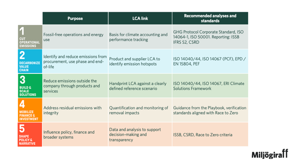 Nedan sammanfattar vi hur Playbookens fem pelare kan kopplas till LCA i praktiken och vilka typer av analyser och standarder som man kan ta hjälp av för att besvara varje pelare.
