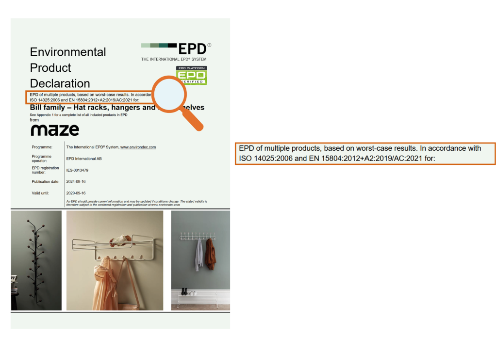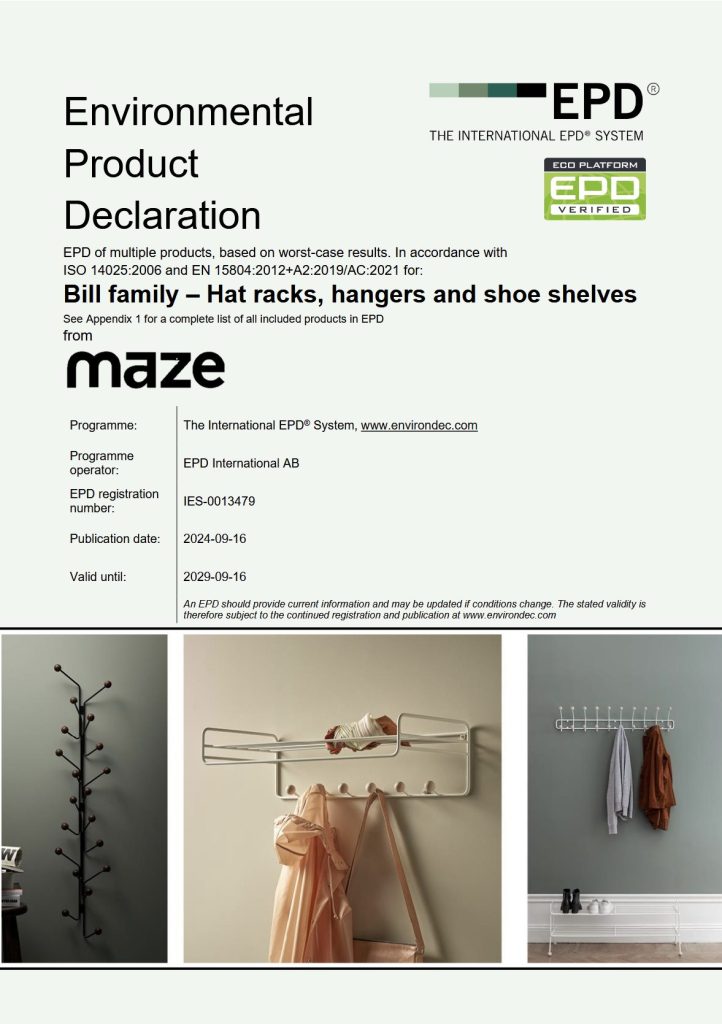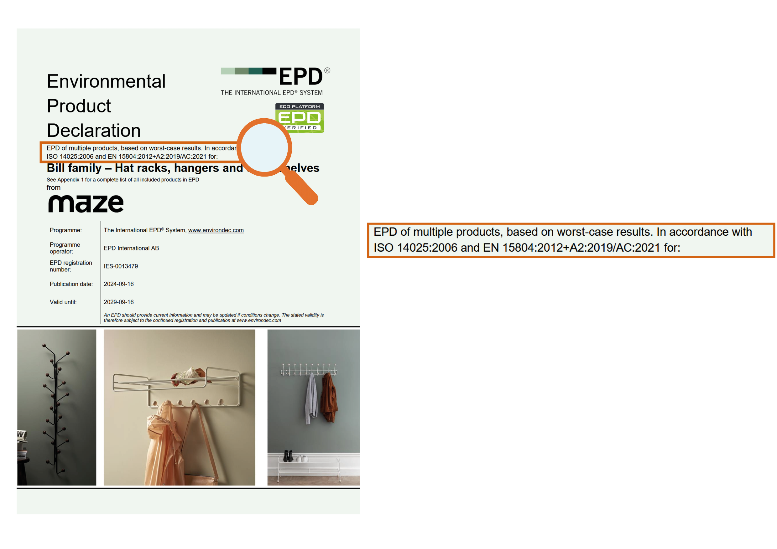 Detta är ett exempel på en multiple product EPD publicerad hos EPD international. Denna EPD är skapad tillsammans med Maze Interior och innehåller hatthyllor, hängare och skohyllor.