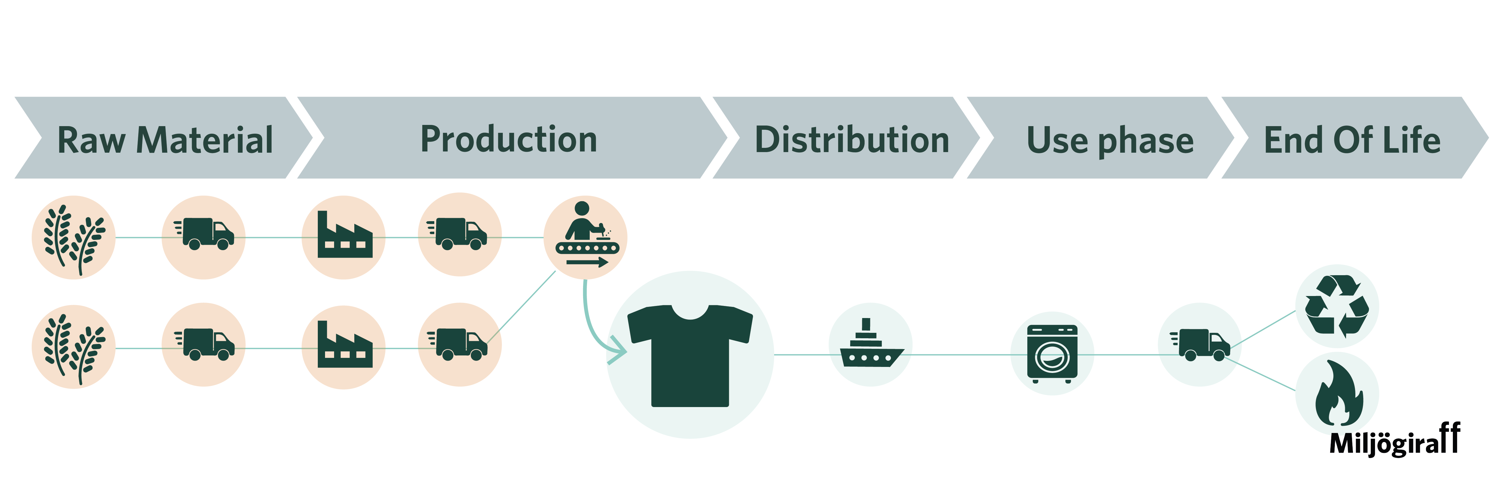En livscykelanalys utvärderar produktens miljöpåverkan genom hela dess livscykel, från råmaterial till sluthantering. Därför behöver värdekedjan beskrivas i detalj. Vilka faser går produkten igenom? Är det flera produktionssteg? Innehåller produkten flera komponenter? Börja specificera de olika stegen. Vi rekommenderar att arbeta visuellt i denna fasen.