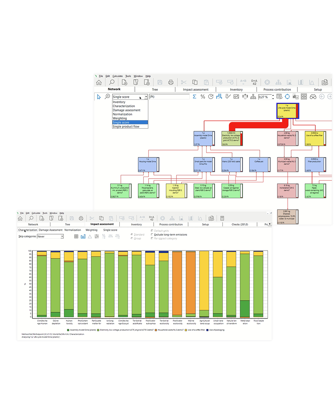 SimaPro Craft kan även användas för att undersöka hur förändringar i exempelvis materialval, energimix eller transporter påverkar en produkts miljöprofil. Genom att justera dessa parametrar kan användaren studera olika scenarier och få en bättre förståelse för vilka delar av livscykeln som driver påverkan.