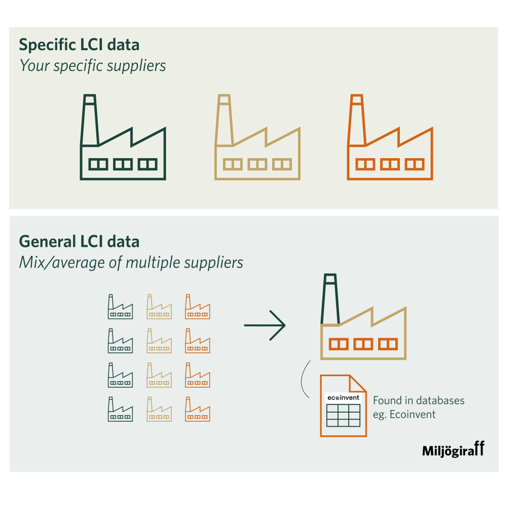 Använd generisk data för att komma igång men byt till specifik data där resultaten påverkas mest. Databaser som ecoinvent är bra och de är ofta helt avgörande för att kunna göra LCA i praktiken. Men om ambitionen är att gå från kartläggning till förändring, behöver du också fånga verkligheten i din egen värdekedja.