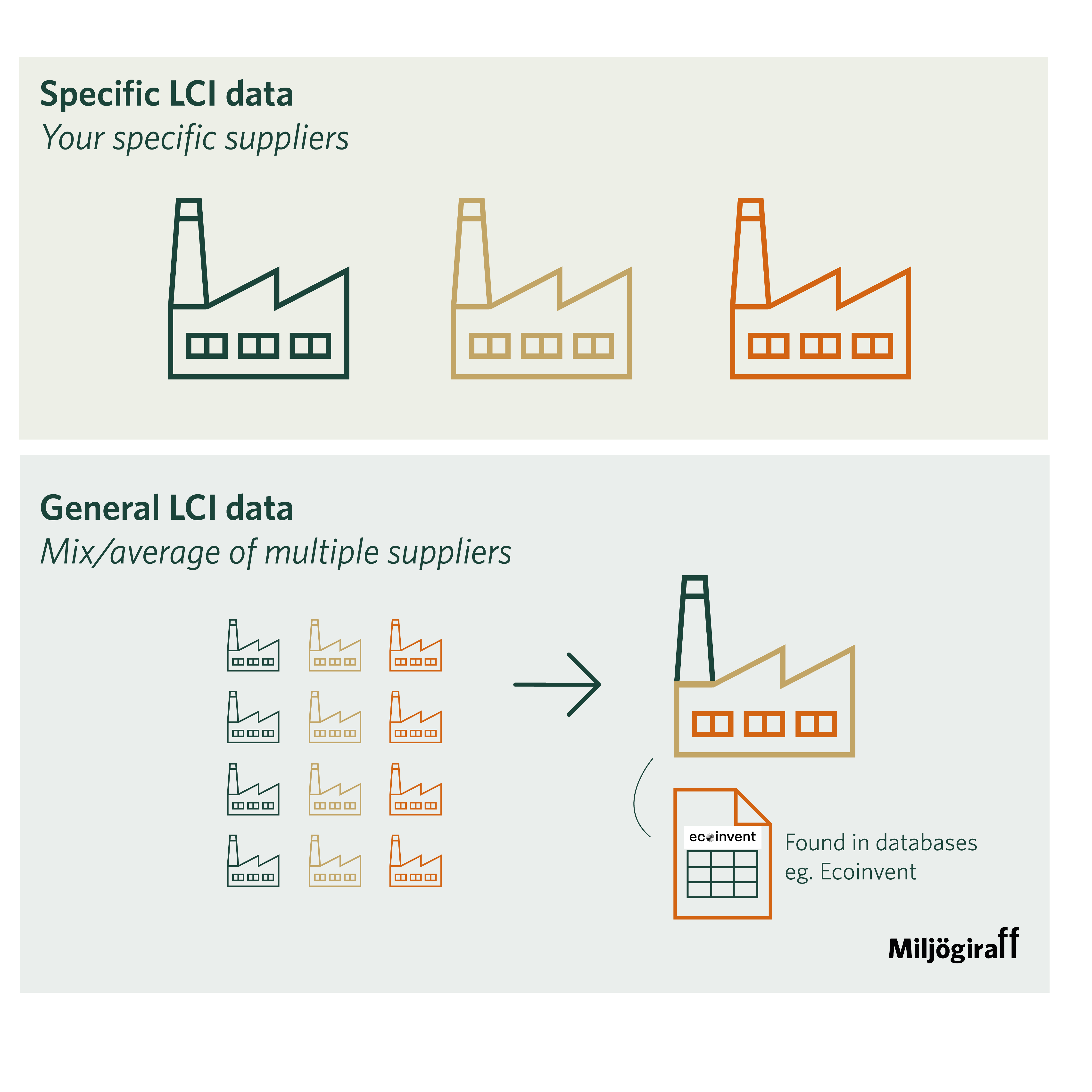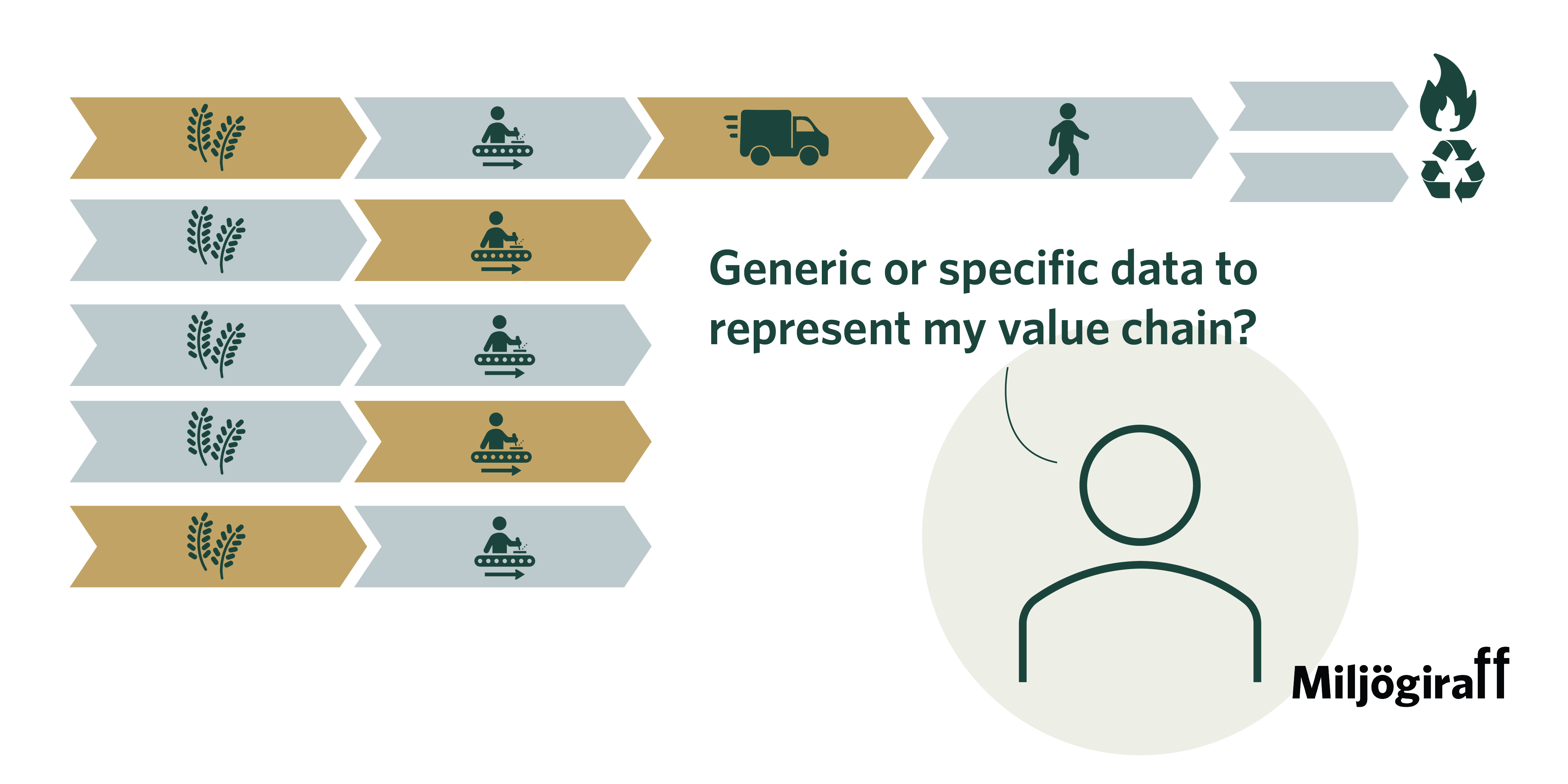 Använd generisk data för att komma igång men byt till specifik data där resultaten påverkas mest. Databaser som ecoinvent är bra och de är ofta helt avgörande för att kunna göra LCA i praktiken. Men om ambitionen är att gå från kartläggning till förändring, behöver du också fånga verkligheten i din egen värdekedja.