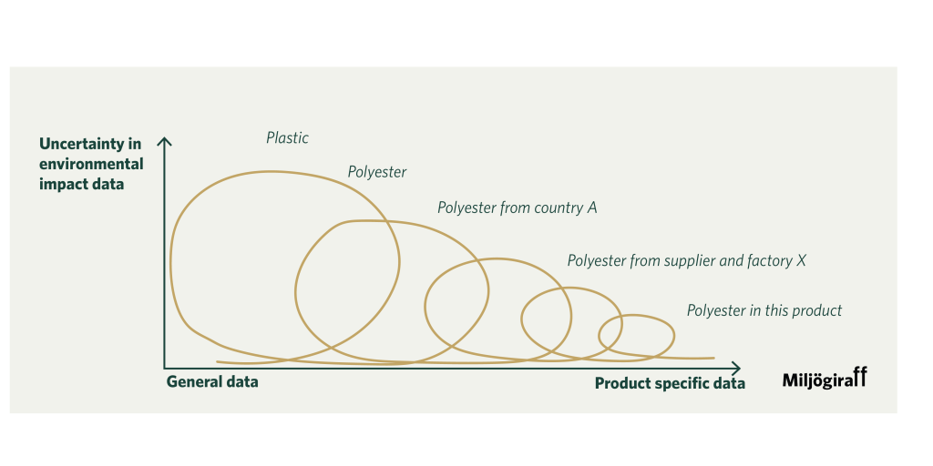 Att använda mer specifik data i en GHG Scope 3-beräkning gör det möjligt att komma närmare verkligheten, men tar längre tid att ta fram. Med data från produskspecifika LCA eller EPDer kan företag förstå utsläppen på produkt- eller materialnivå och utifrån detta ta fram mer träffsäkra strategier och åtgärder