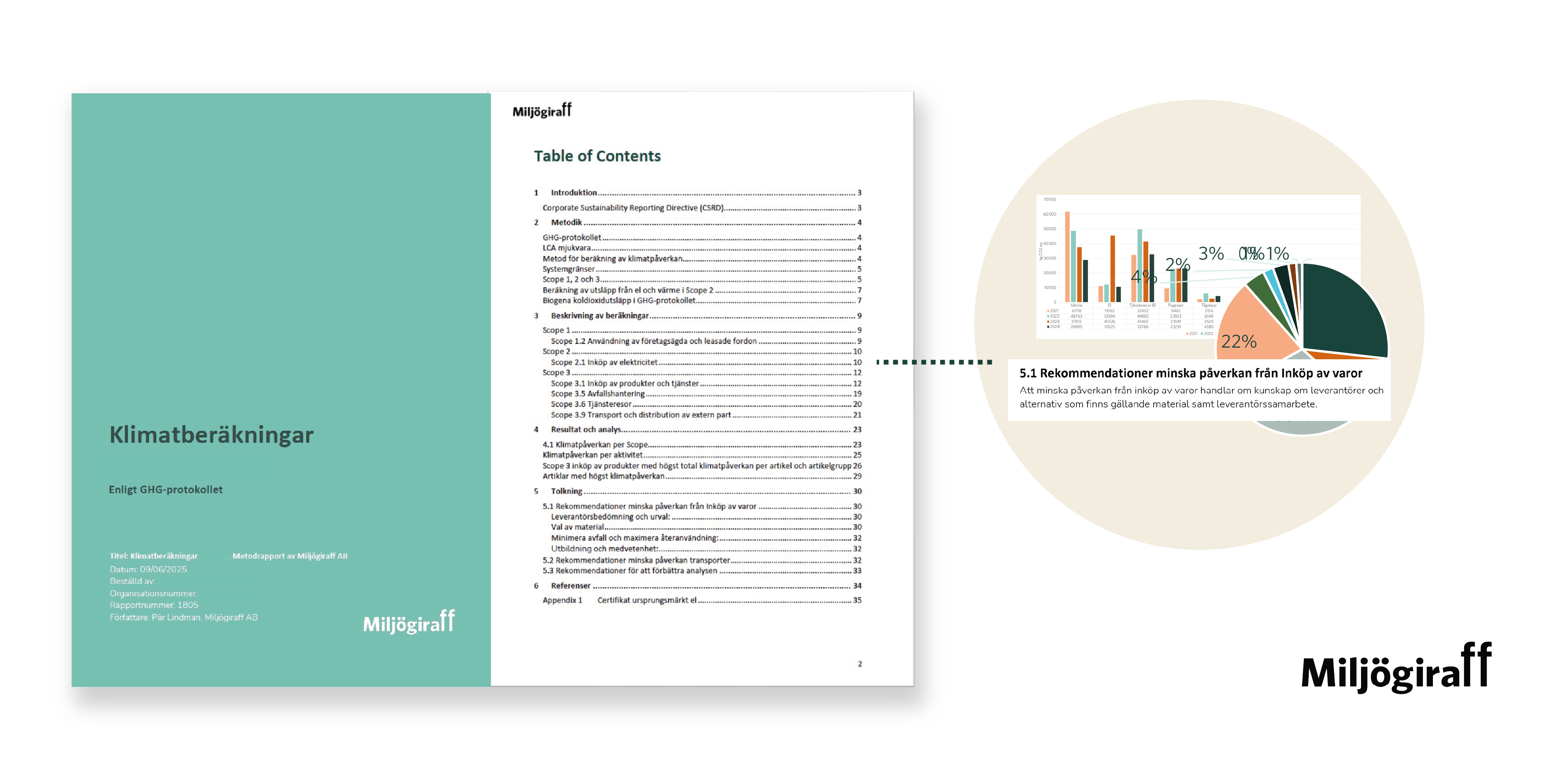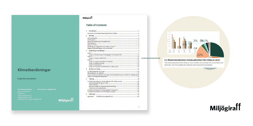 Vi sammanfattar arbetet i tydlig och visuell rapport. Ni får en komplett rapport i enlighet med standard som går att använda i er hållbarhetsrapportering. Klimatrapporten innehåller alltid: